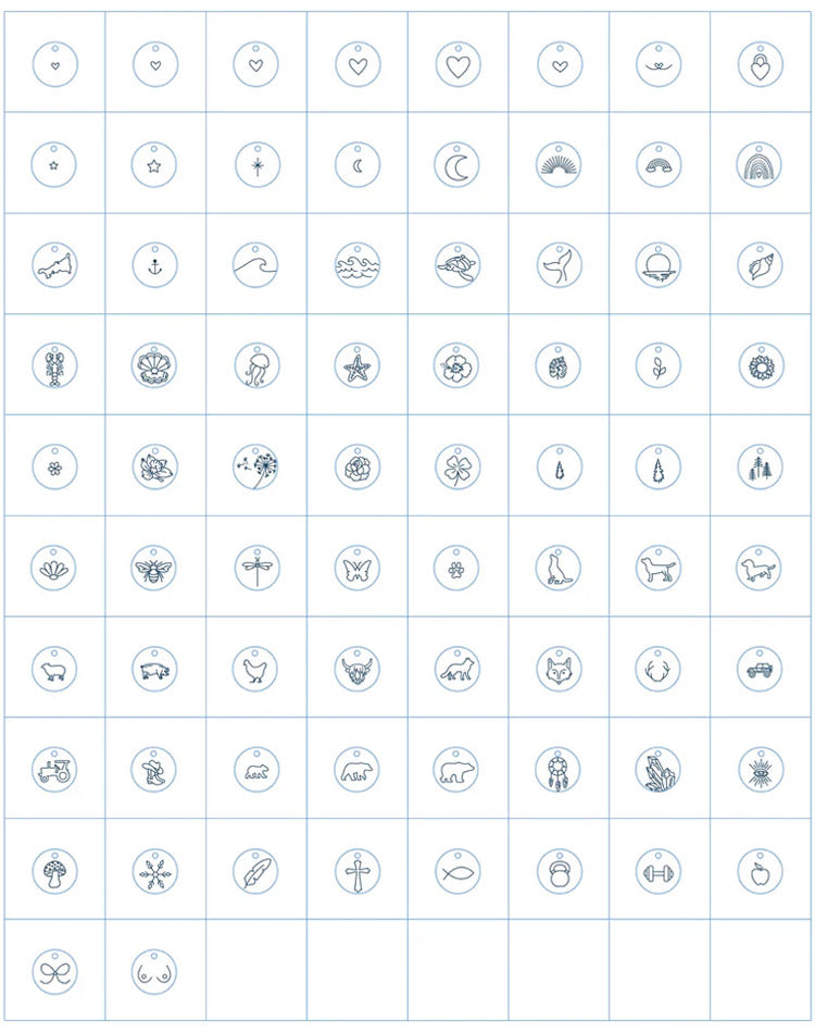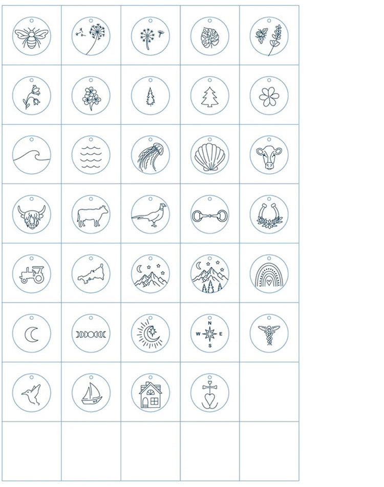 Below you'll find two grids of design stamps; one grid features designs that fit on my 9mm mini discs and a second grid where the designs fit on my 13mm midi discs.